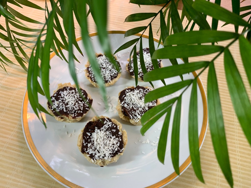 Amandelmeel bevat veel vitamine E, wat goed is voor het immuunsysteem. Het heeft een hoog eiwitgehalte en veel goede vetten: poly onverzadigde vetzuren, om precies te zijn. Een juist gehalte hieraan bevordert het herstel van oppervlakkige snijwonden en brandwonden. Het zorgt ook voor een snellere genezing van verschillende huidproblemen. Amandelmeel bevat, net als de kokosschilfers veel ijzer, wat onder andere vermoeidheid zal verminderen. De kokosschilfers zijn een goede bron van vezels en geven je veel energie. Dit alles in combinatie met chocolade kan gewoon niet meer misgaan. 🙂