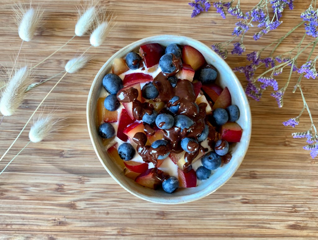 - Werk de havermout af met de Griekse yoghurt, de pruim, de blauwe bessen en de gesmolten chocolade.