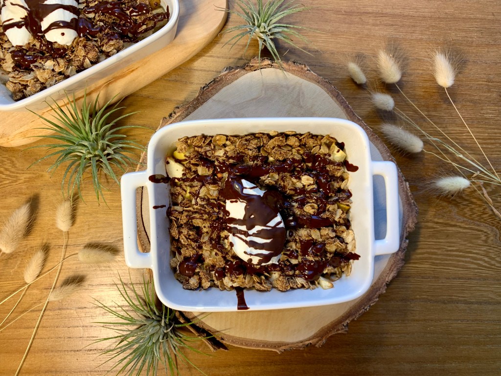 - Neem nu twee vuurvaste kommetjes. Als onderste laag verdeel je het banaan-appelmengsel over de kommetjes. Daarna doe je er de crumble overheen.