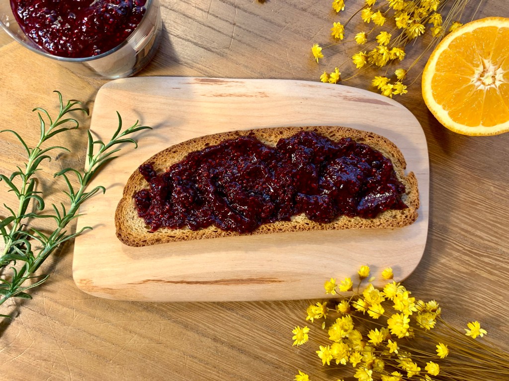 - Doe de bosbessen, de blaadjes rozemarijn, de zestes sinaasappel, het sap van de sinaasappel en de honing in een blender en blend.