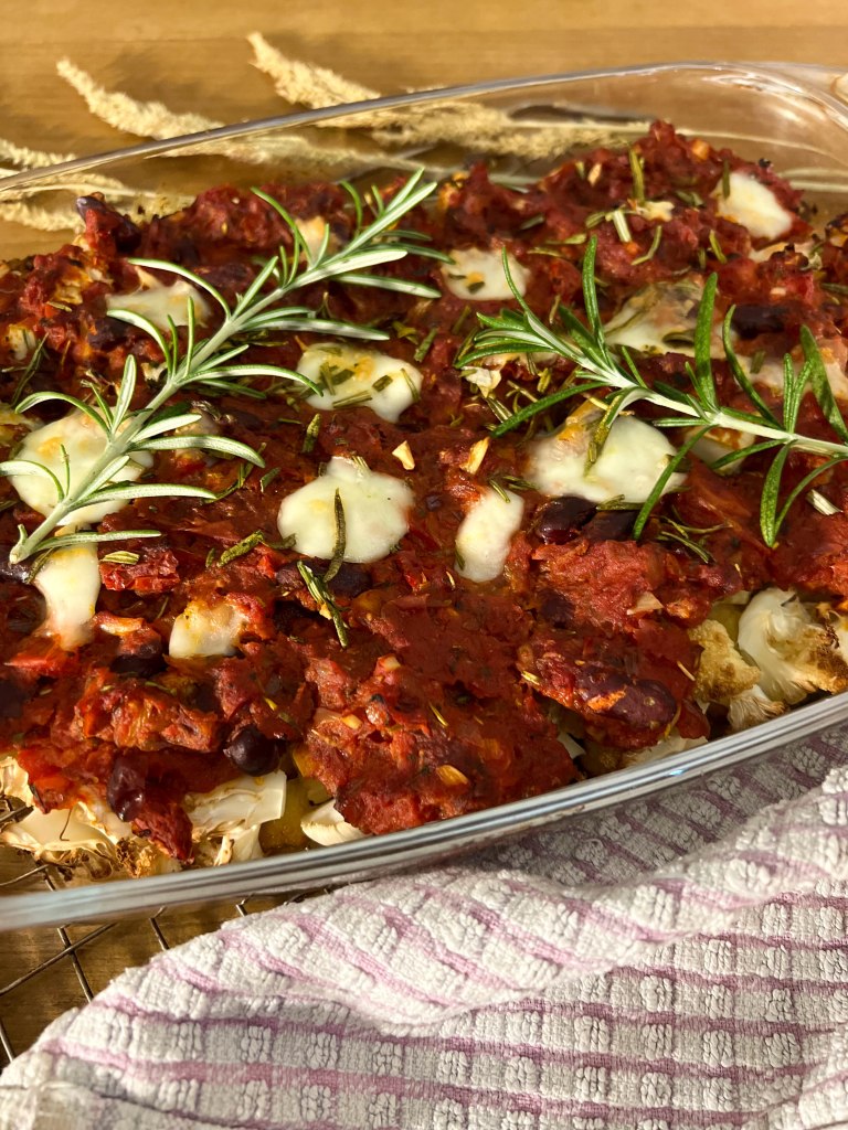 En dan is er nog een voordeel; het is een handige, leuke en lekkere manier om veel groenten te eten. Bloemkool en tomaat vormen namelijk de basis van het gerecht. Dit alles werken we af met mozzarella en rozemarijn, voor de kleur, voor de smaak en omdat bijna alles in het leven beter wordt door er mozzarella en rozemarijn bij te serveren. Of toch qua ovenschotels dan. 😉