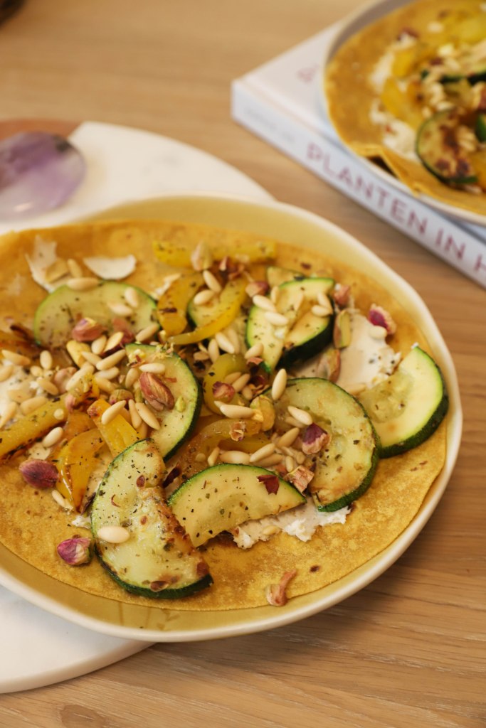 - Dresseer er de groenten op en werk af met de pijnboompitten en de gehakte pistachenootjes.