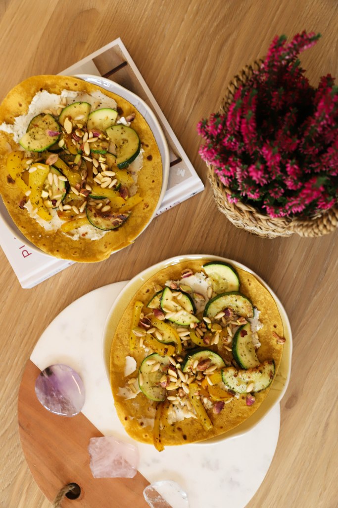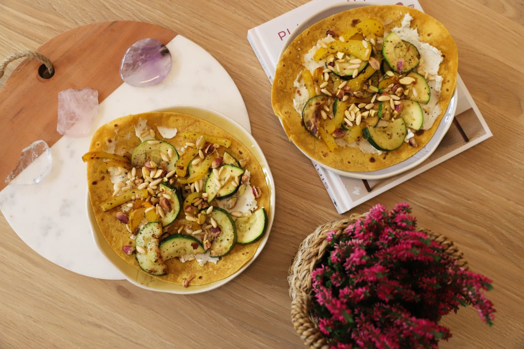 - Verwarm zachtjes de groentewraps in een pan door ze een minuut op elke kant te leggen.
