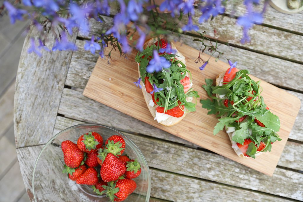 Een broodje (want dat is zo snel en makkelijk om te maken), belegd met aardbeien (want die zijn zo zoet en lekker verfrissend). Daar bovenop komt rucola met zijn eerder nootachtige smaak. De geitenkaas zorgt voor friste in het gerecht en houdt het verhaal spannend. Het geheel wordt afgekruid met fleur de sel omdat dat nog net wat verfijnder smaakt dan gewoon zout. En peper, want ja… daar breng je elk goed gerecht mee op smaak.