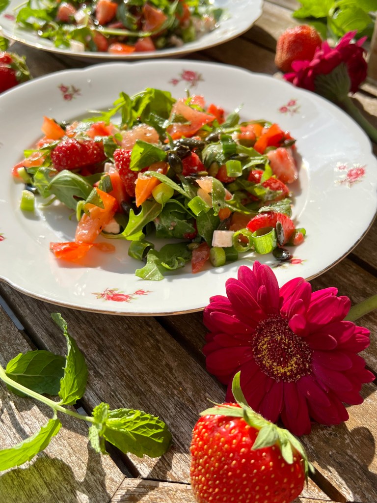 De aardbeien en fetakaas geven de salade iets verfrissend en zorgen ook voor een fijn contrast in smaken. De zonnebloempitten zorgen voor extra bite. Tomaten en rucola maken het geheel af. Het recept vind je hier.