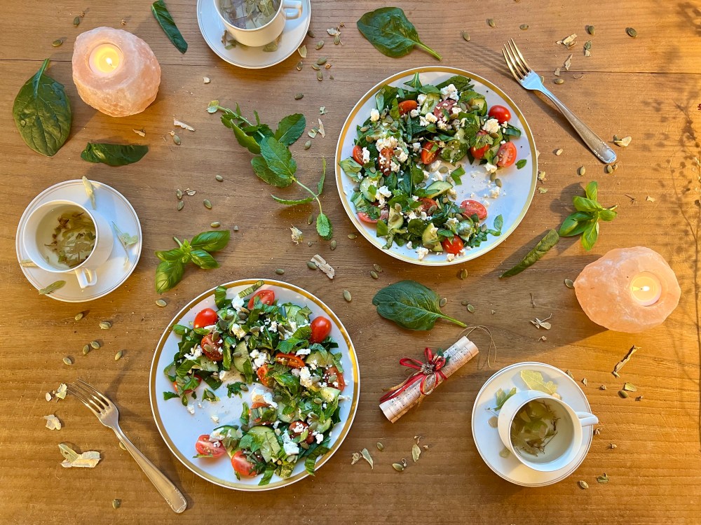 Als er ergens ter wereld een vijfkoppige vriendengroep zou bestaan, waar ze allen van spinazie houden, dat zouden ze vast besluiten om een muziekband te starten waarmee ze liedjes zingen over hun liefde voor deze donkergroene bladgroente. Op hun repetities, die sowieso op dinsdagavond en zondagmiddag doorgaan, zouden ze geroerbakte spinazie eten. Toch kan spinazie ook perfect rauw gegeten worden én is het nog heel lekker ook. Zeker als je babyspinazie gebruikt. Dat zijn jong geoogste en dus kleinere blaadjes die iets zachter zijn van structuur en smaak. Ze vormen het uitgangspunt van deze salade.
