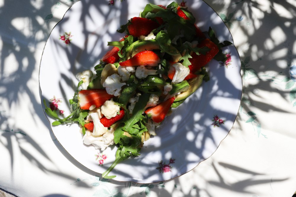 Dit recept verenigt het beste wat de zomer te bieden heeft in één maaltijd. Aardbeien, bloemkool en rucola vormen de basis, geroosterde pijnboompitjes en avocadoblokjes maken het geheel af.