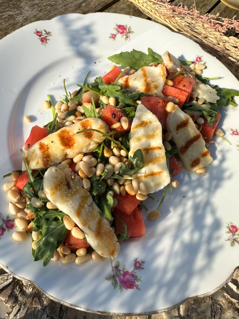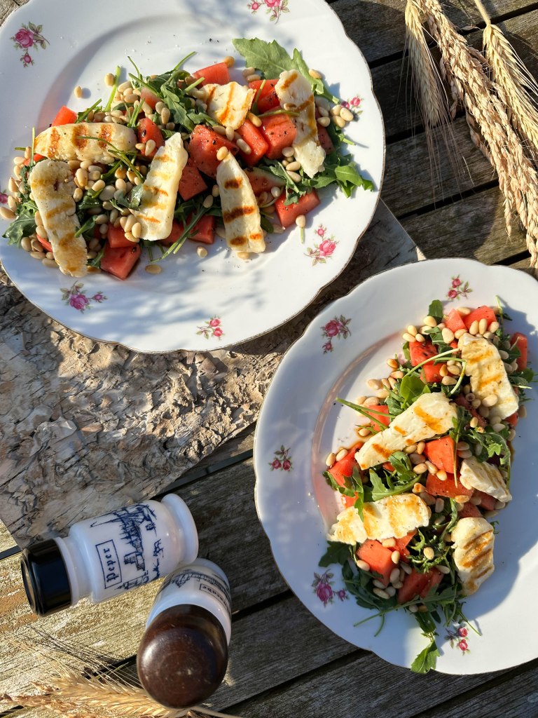 Snelle salade met watermeloen, rucola en halloumi