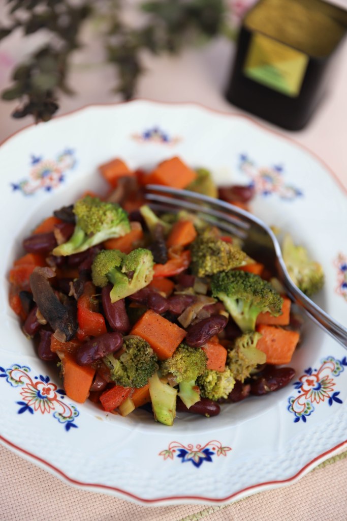 - Meng de zoete aardappelblokjes onder het geheel eens ze gaargestoomd zijn.