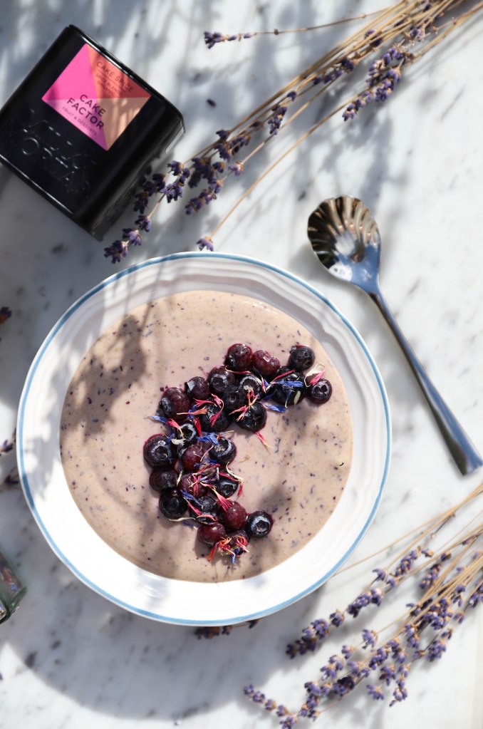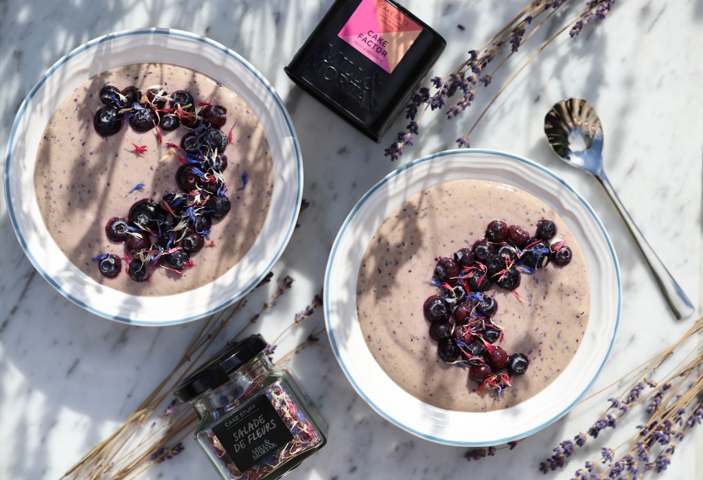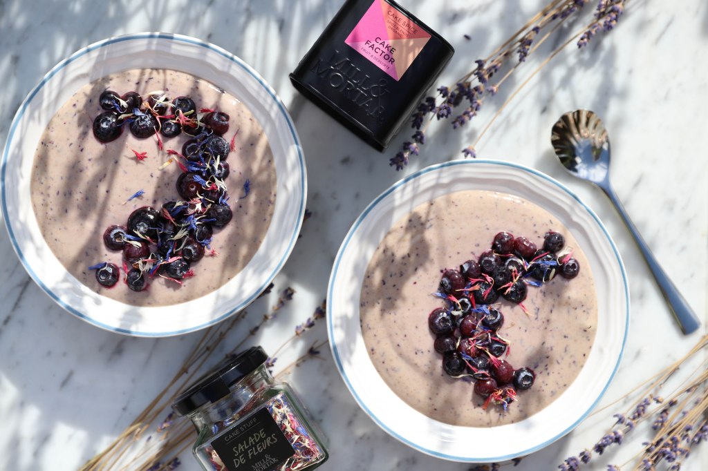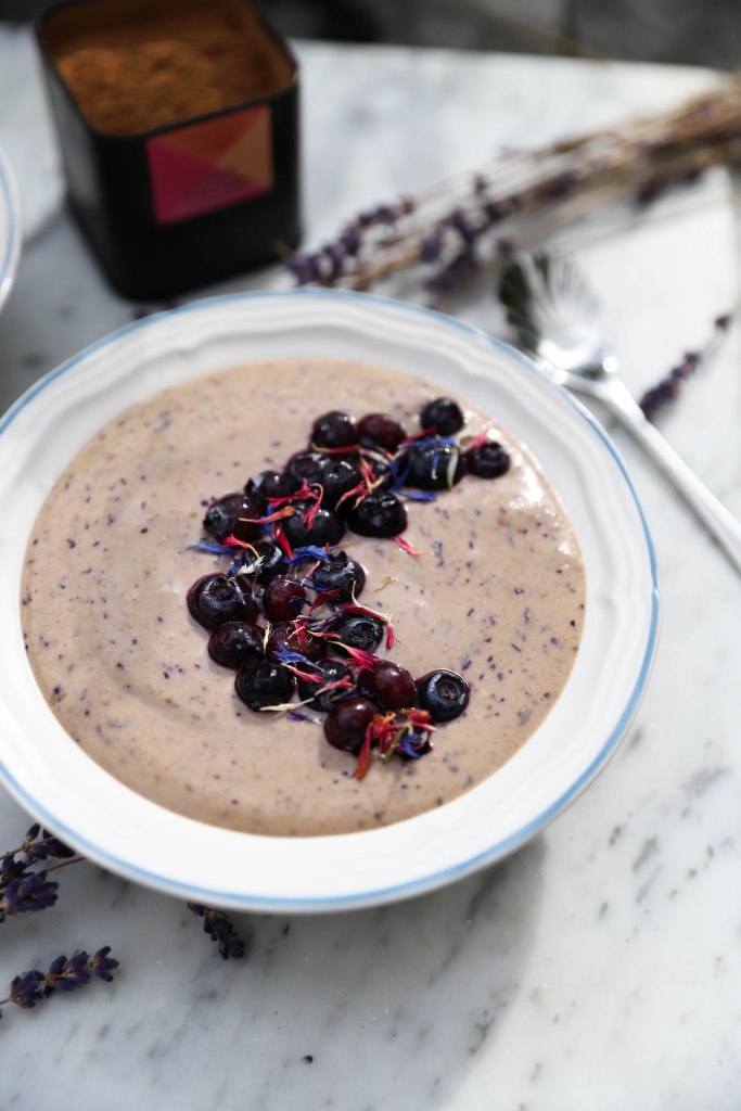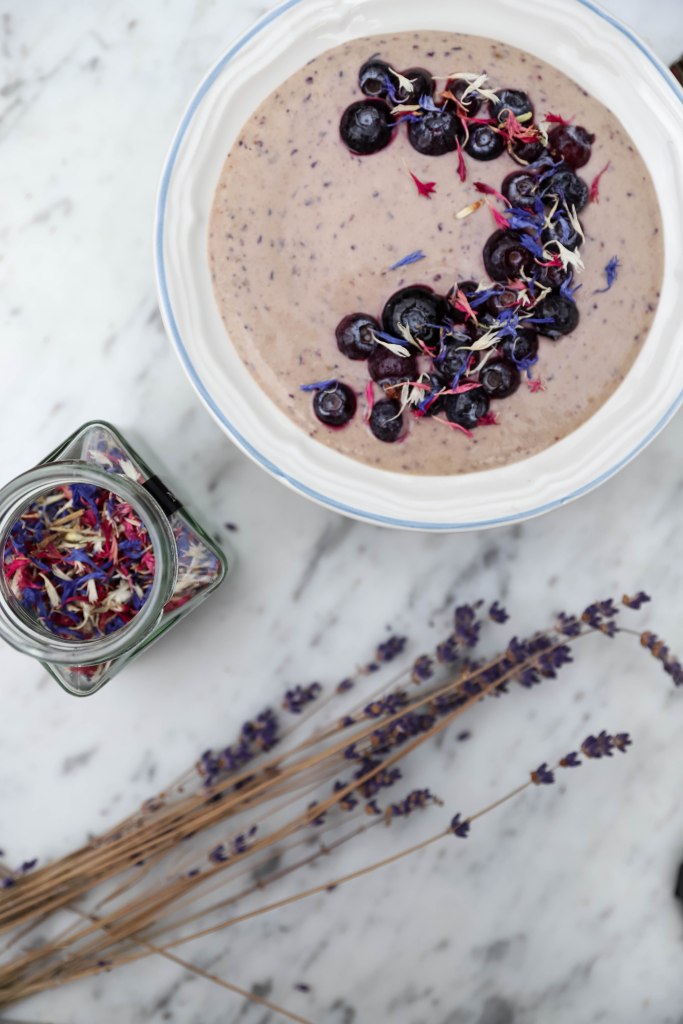- Serveer in een mooi kommetje en werk af met extra blauwe bessen en de bloemetjes.