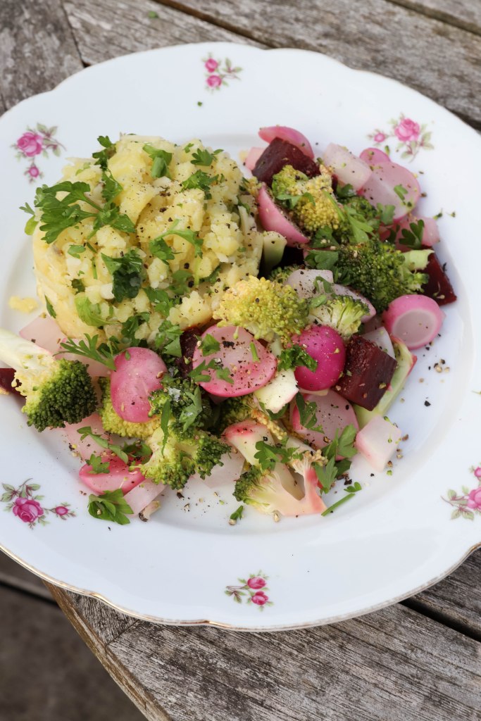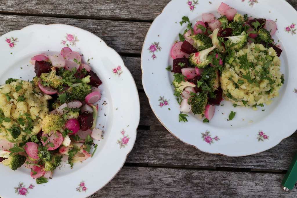 Je kunt de overschot van de krieltjes gebruiken in deze groentenschotel met zomerse seizoensgroenten.