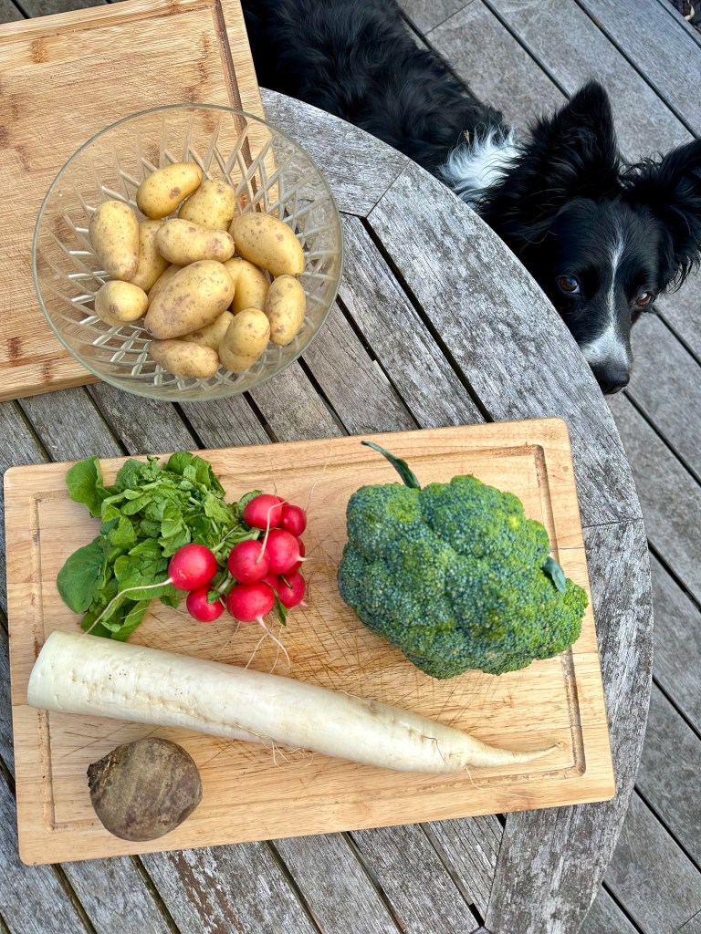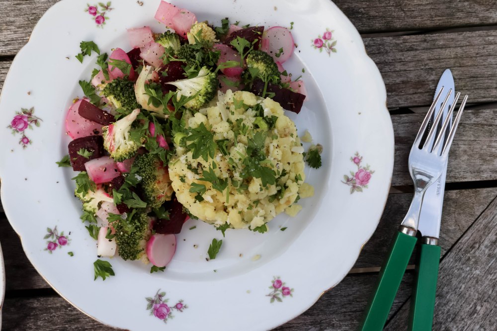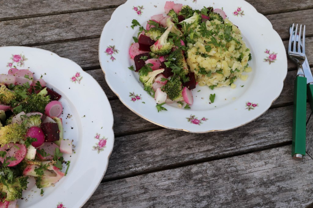 2. Snijd intussen de broccoli in roosjes, de radijzen in schijfjes en de rammenas in blokjes. Schil de rode biet en snijd ook in blokjes.