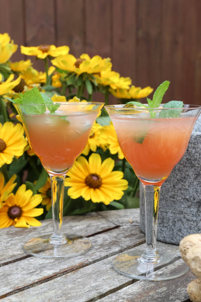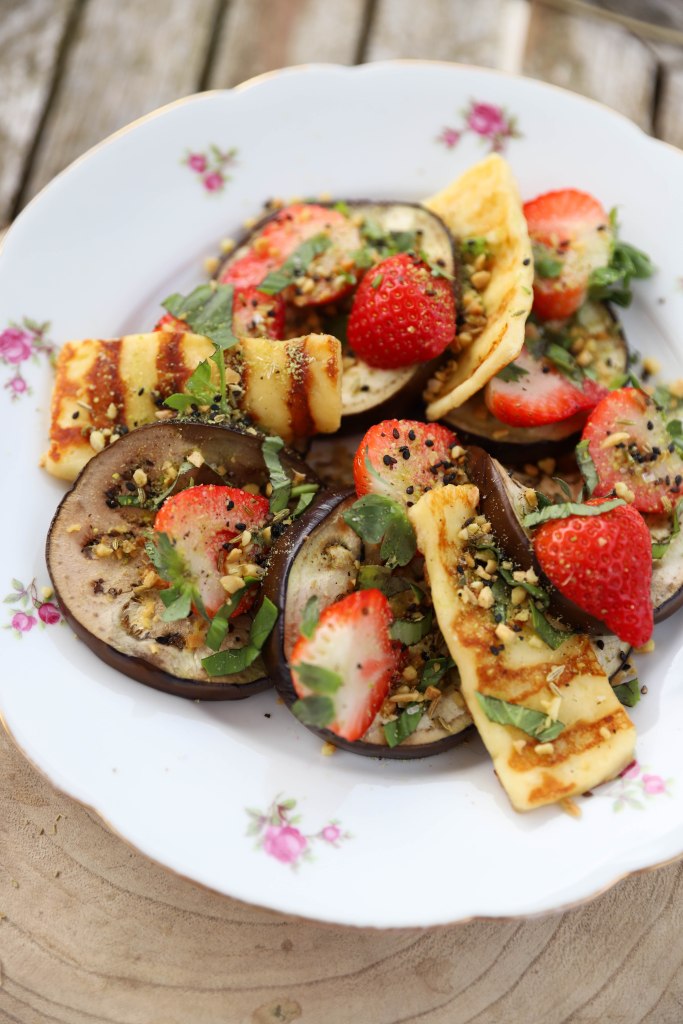 Het voorgerecht is een lichte maar toch zeer boeiende salade. De gegrilde aubergine en halloumi geven meteen barbecue vibes. De aardbeitjes ertussen zorgen voor een verrassende toets. De mocktail is een lichtjes zoete en lichtjes bittere combinatie van pompelmoes en gember. De munt zorgt voor iets verfrissend. Deze mocktail is zo lekker, het is echt degene waar ik het meest fier op ben. Het gaat daarnaast heel mooi samen met de salade.