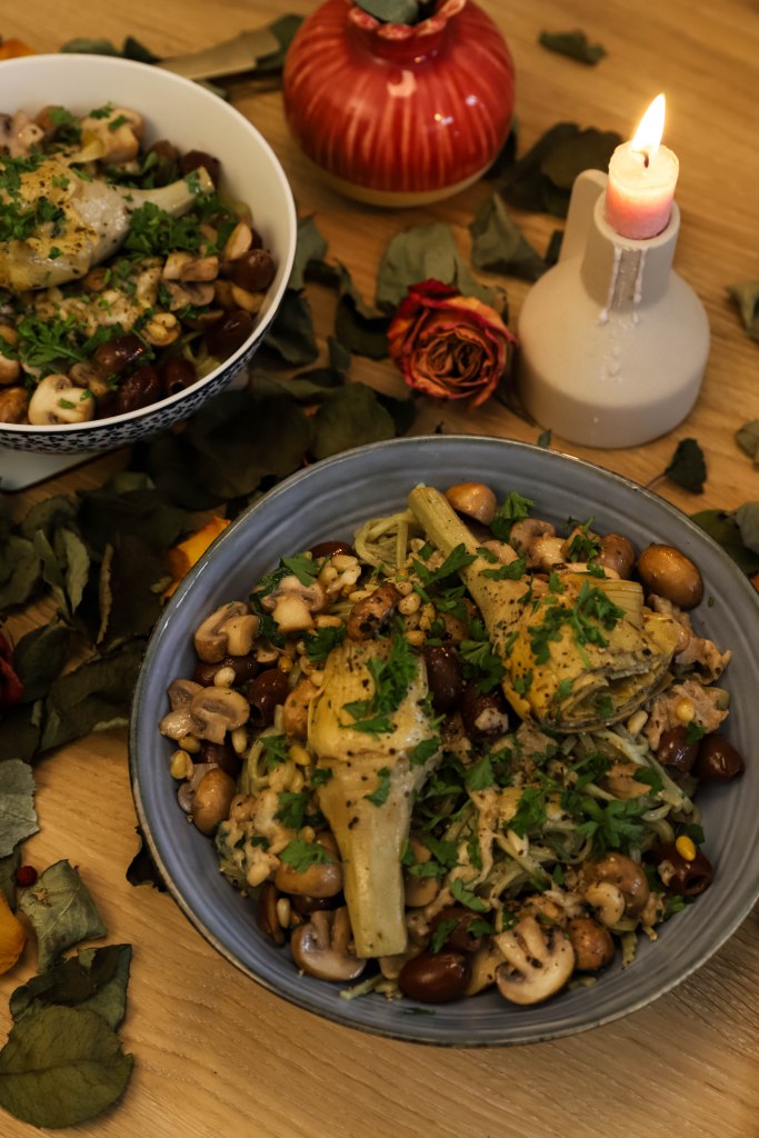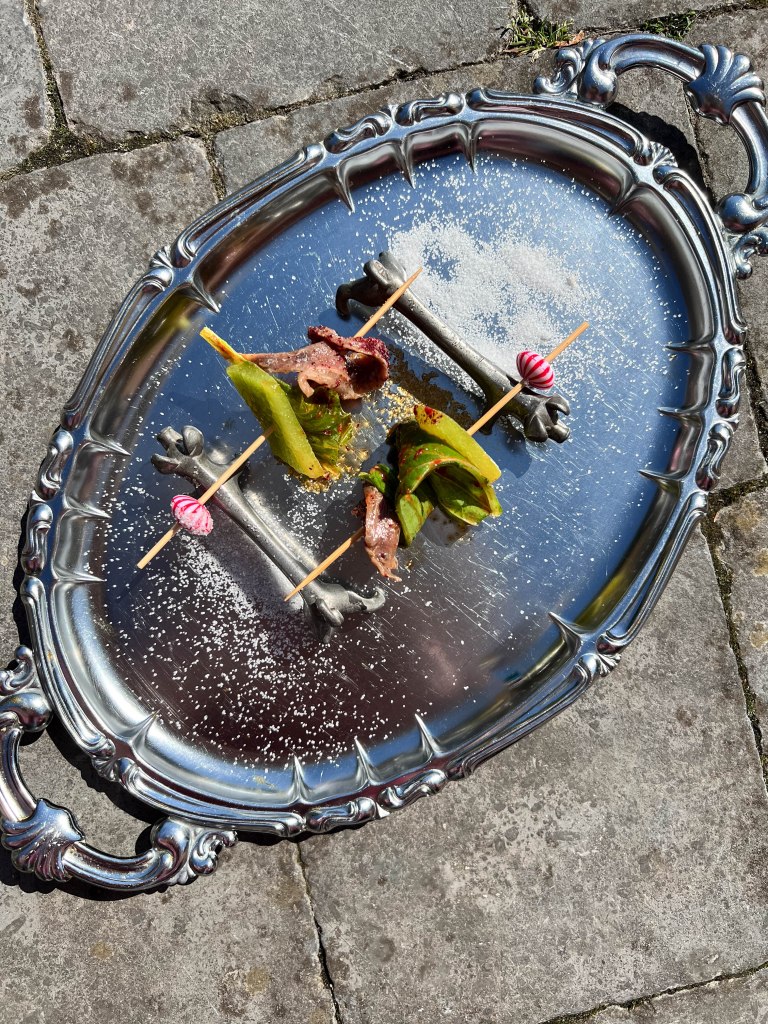Als hapje hebben we een typisch Spaanse verwelkoming. Een gilda is vaak het eerste gerechtje dat geserveerd wordt van de vele tapas die je krijgt op een avond. Dit is mijn versie ervan met groenten (hoe kan het ook anders?😉) en een unieke kruiding. In de mocktail zorgen gember en verse kruiden voor een pittig geheel dat zeker niet moet onderdoen voor het sterk afsmakende gerecht.