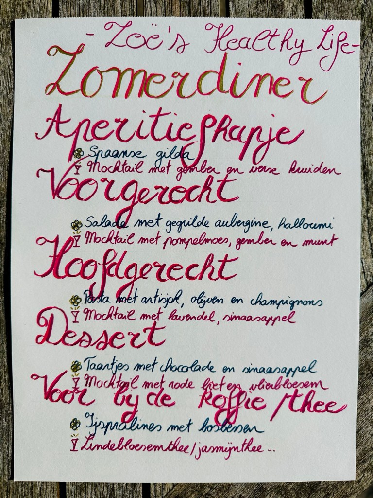 Warme temperaturen en dagen waarin het lang licht blijft, nodigen uit om in goed gezelschap te genieten van lekker eten. Daarom stelde ik dit menu samen met 5 gangen aan gezonde recepten boordevol groenten, die gelijk staan aan een hele avond genieten. Je kunt het grootste deel van de recepten op voorhand klaarmaken. Zo kan de chef des huizes ook mee genieten. Alle recepten zijn opgebouwd met seizoensgroenten. Hierdoor werk je meteen ook met de smaakvolste, meest ecologische en goedkoopste producten die nu te verkrijgen zijn.