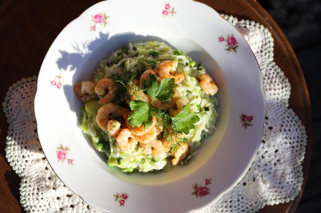 - Dresseer op mooie borden een bodempje van de groenten-rijst mengeling, daarop de garnalen en werk af met de kruiden.
