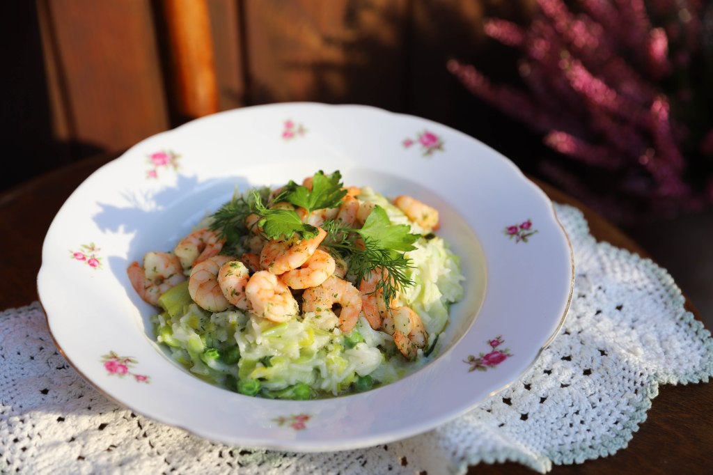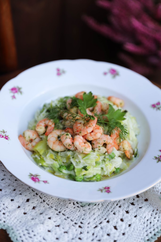 Klaar in 30 minuten en met een rijkelijke hoeveelheid groenten. Dit gerecht met prei, erwten en rijst is een makkelijke maaltijd voor als je eens wat minder tijd hebt. De garnalen zorgen voor iets feestelijk.